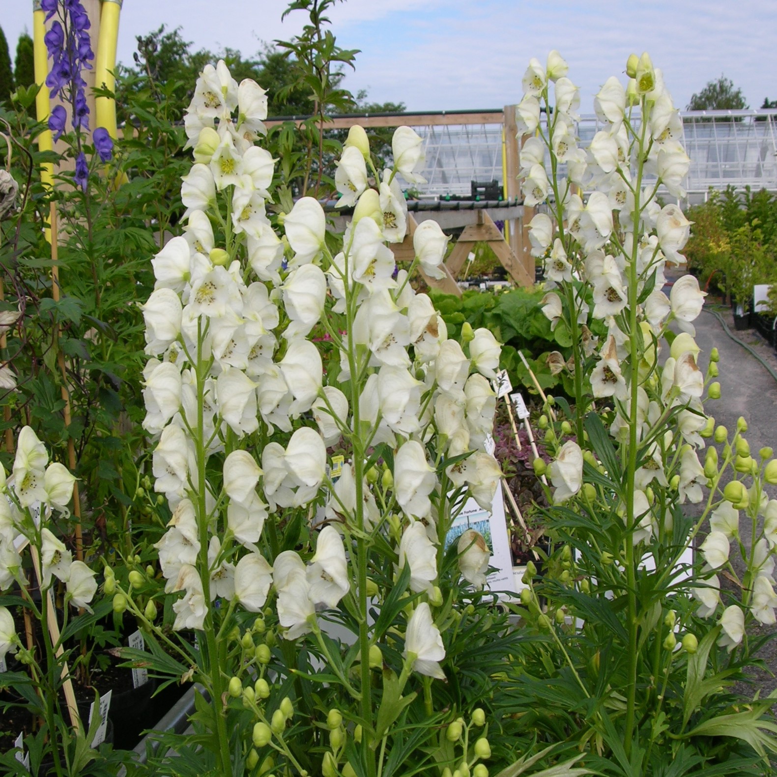 Valkokukkainen aitoukonhattu, jolla on kaunis pysty kasvutapa ja syvänvihreä lehdistö. Korkeana ja tuuheana kasvina se sopii hyvin ryhmien taustoille sekä sinisen lajitoverinsa vierelle. Viihtyy auringosta puolivarjoon, tuoreessa ja syvämultaisessa maassa. Hyvä leikkokukka sekä perhoskasvi. Koko kasvi on myrkyllinen. Ei yleensä vaadi tukemista. Istutusväli 0,3 m.
