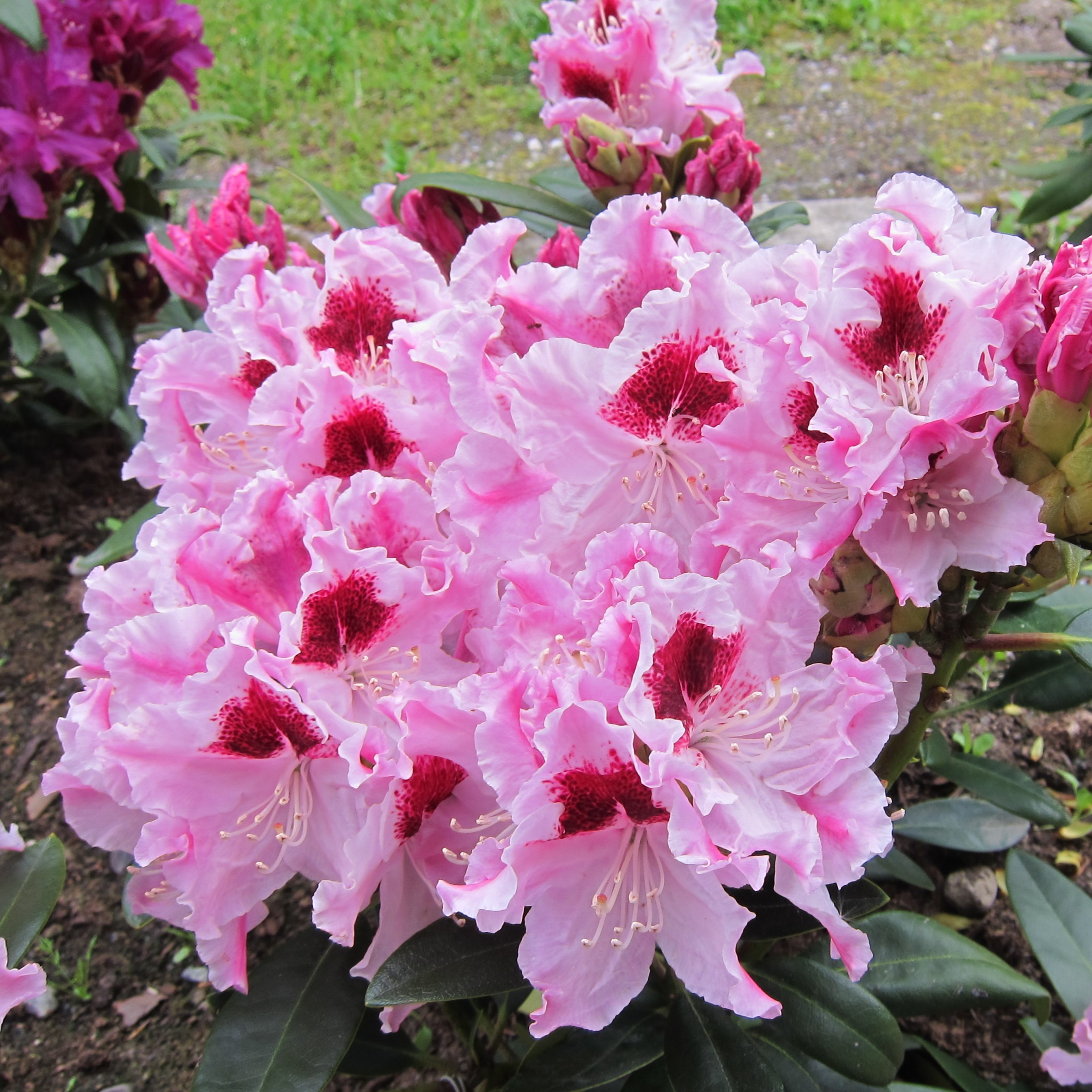 Rhododendron Royal Butterfly (Haaga x Kabarett) Vaaleanpunainen kukinto, jossa punertavan ruskea silmä. Runsaskukkainen, terälehdet kauniisti aaltoilevat.