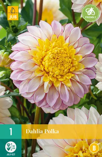 Anemone-tyyppinen daalia Polka kukkii koko kesän heinäkuusta ensimmäisiin pakkasiin. Daalia Polka kasvaa noin 90-100 cm korkeaksi. Joskus on tarpeen tukea kukkavarsia.
