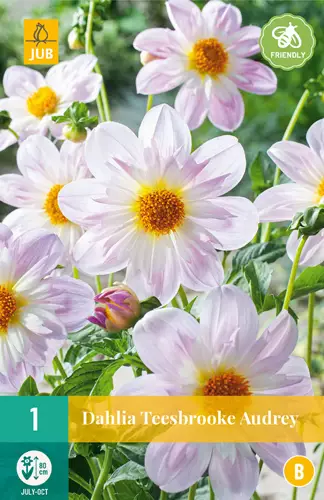 Daalia Teesbrooke Audrey kukkii koko kesän heinäkuusta ensimmäisiin pakkasiin asti. daalia Teesbrooke Audrey kasvaa noin 80 cm: ksi. sopii siksi hyvin myös ruukkuihin istutettaviksi terassille tai parvekkeelle.