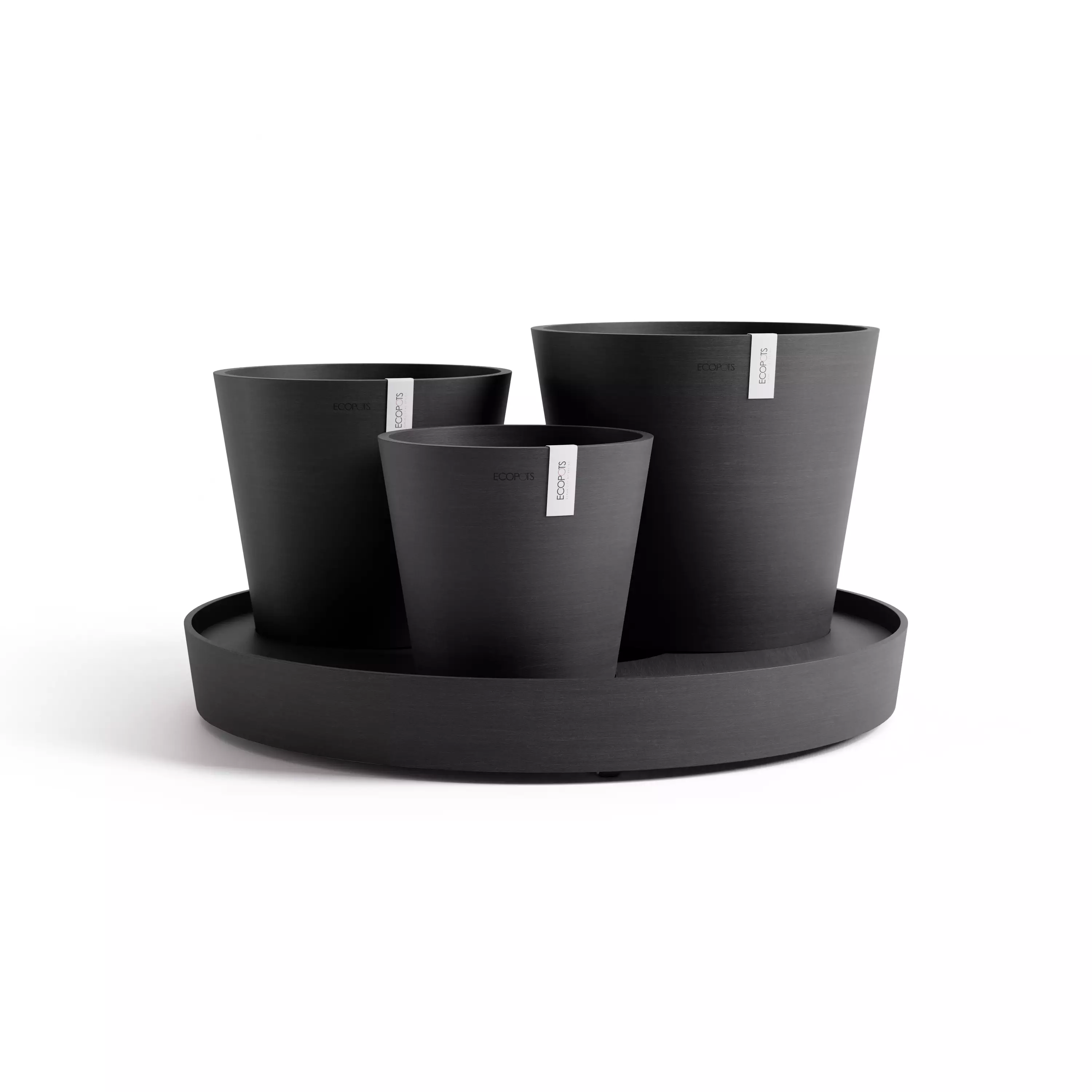 Kierrätysmuovista valmistettu, tyylikäs kolmen ruukun setti aluslautasella.