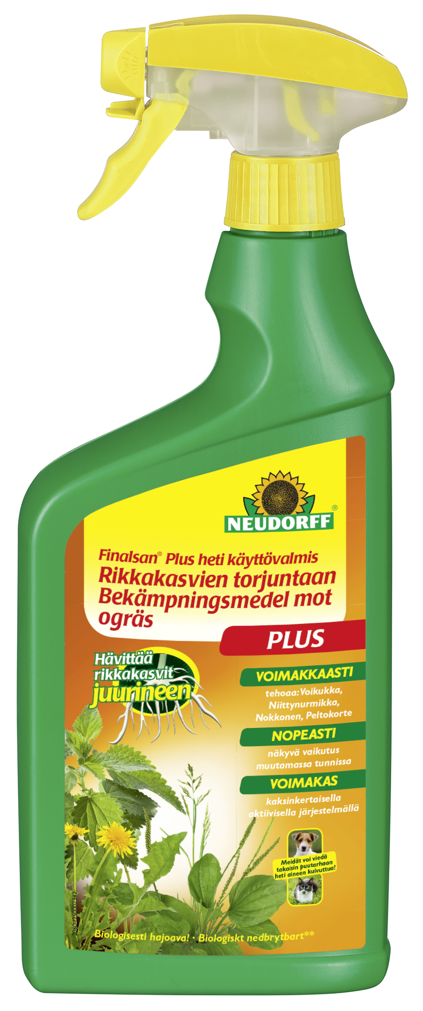 Tehoaa mm. voikukkiin, ratamoihin, pihatähtimöön, nokkoseen ja ohdakkeeseen sekä muihin rikkakasveihin. Finalsan®+ hävittää myös vuohenputken ja peltokortteen. Tehoaa hyvin myös alhaisissa lämpötiloissa. Aineella ei ole pitkäaikaisvaikutusta. Ei sovi rikkakasvien torjuntaan nurmikoilla, koska kaikki vihreät kasviosat tuhoutuvat. Käsiteltyjä alueita voi käyttää – myös kotieläimet – heti aineen kuivumisen jälkeen. Rikkaruohojen torjunta Neudorffin Finalsan®+-rikkakasvien torjunta aineet ovat tehokkaita - Käsiteltyjä alueita voi käyttää – myös kotieläimet – heti aineen kuivumisen jälkeen - Käsitellyille alueille voidaan istuttaa kasveja jo kahden päivän kuluttua - Tehoaineet eivät keräänny maaperään Valmisteen tehoaineina ovat pelargonihappo ja maleiinihappohydratsidi, jotka yhdessä muodostavat nopeavaikutteisen rikkaruohojen torjunta-aineen, joka antaa pitkäaikaisen suojan rikkaruohojen uudelleenkasvua vastaan. Tehokkuus Neudorff rikkakasvien torjunta-aineet ovat täydellisiä torjunta-aineita rikkakasveille ja heinille. Nämä tehoavat sekä yksivuotisia että monivuotisia rikkakasveja vastaan ja ovat tehokkaita myös vaikeasti torjuttaville rikkakasveille, sammaleille ja leville.