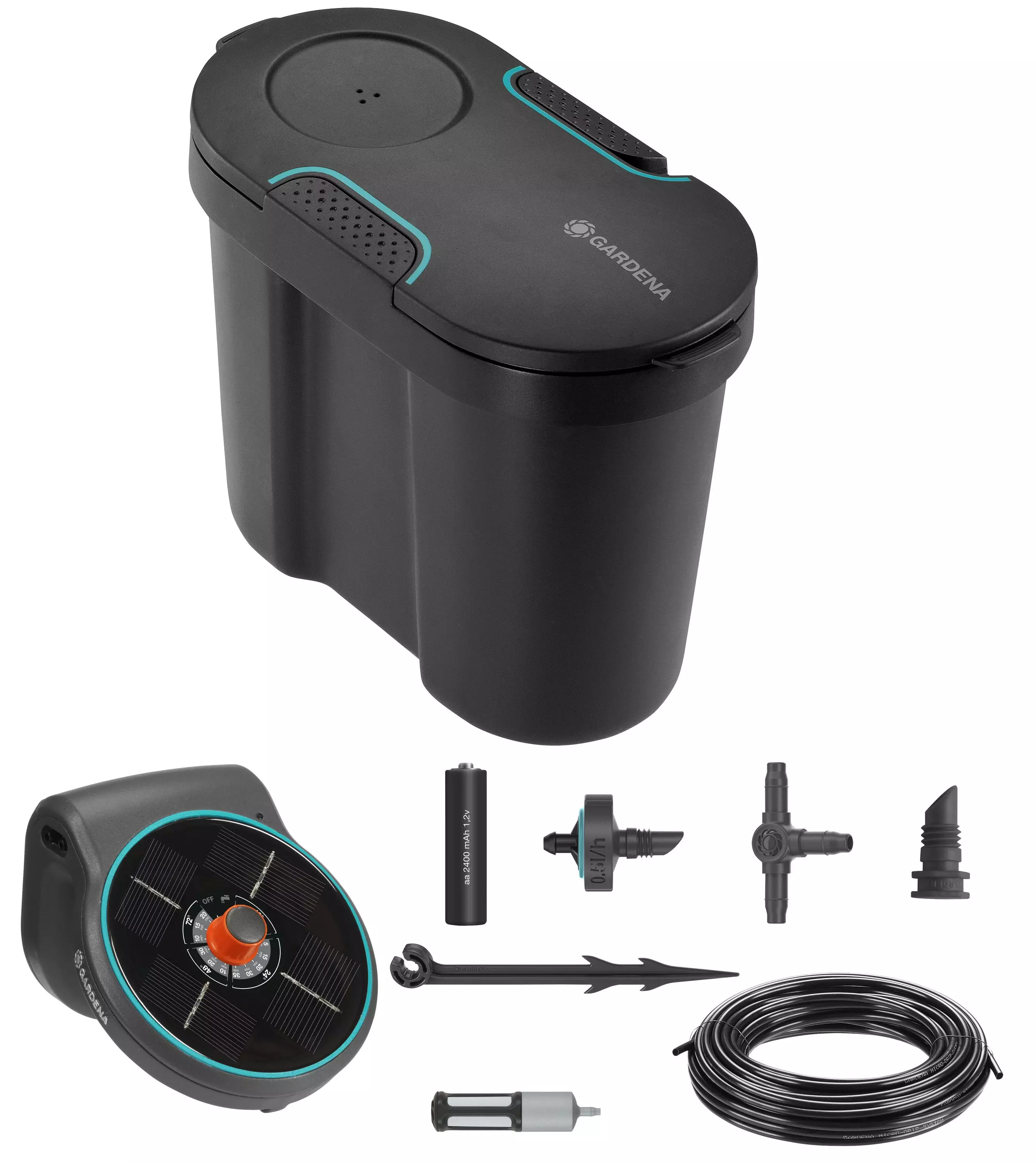 Vesisäiliöllä varustettu AquaBloom-kastelusarja kastelee jopa 20 parveke- ja terassikasvia luotettavasti ja tasaisesti loman aikana tai vaikka koko kastelukauden ajan. Aurinkoenergialla toimiva sarja ei vaadi sähköä tai vesihanaa.