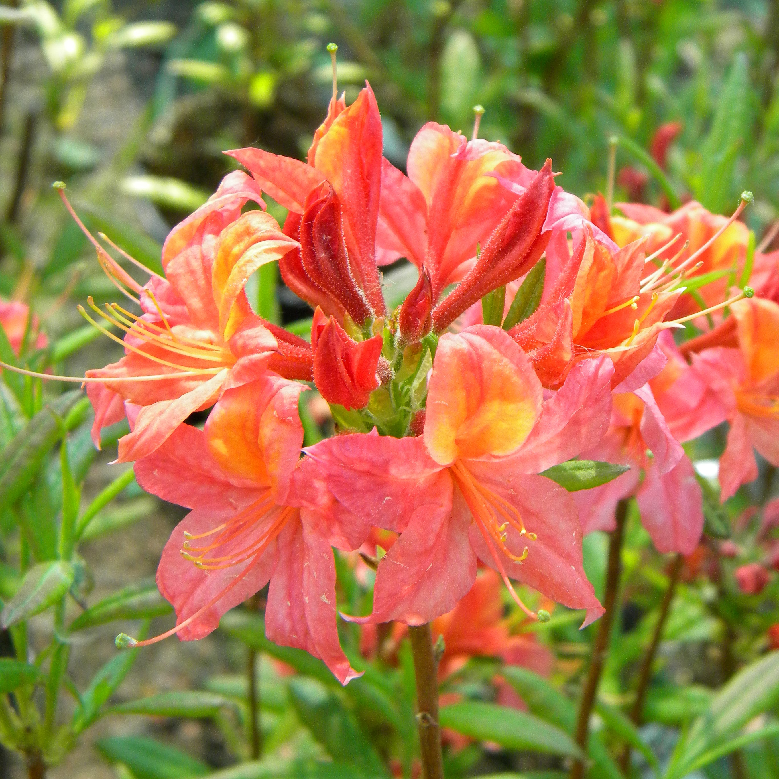 Alkukesällä puhkeavissa kukissa hehkuvat näyttävästi lämpimän oranssin ja punaisen eri sävyt. Raikkaan vihreät lehdet saavat punertavan syysvärin. Alkuperä löydetty Mustilan Arboretumista.