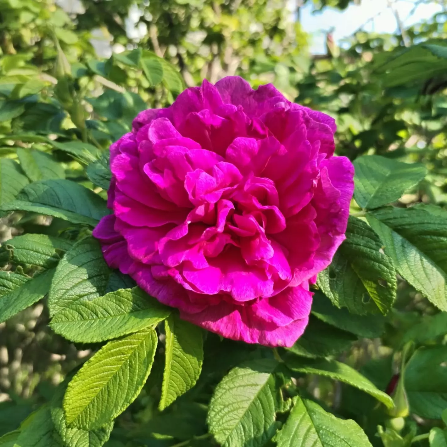 Se kukkii runsaasti heinäkuun alussa sekä uusii kukintaansa koko loppukesän ajan. Kerrotut karmiininpunaiset kukat ovat suuret, jopa 12 cm halkaisijaltaan sekä voimakkaan ruusun tuoksuiset.