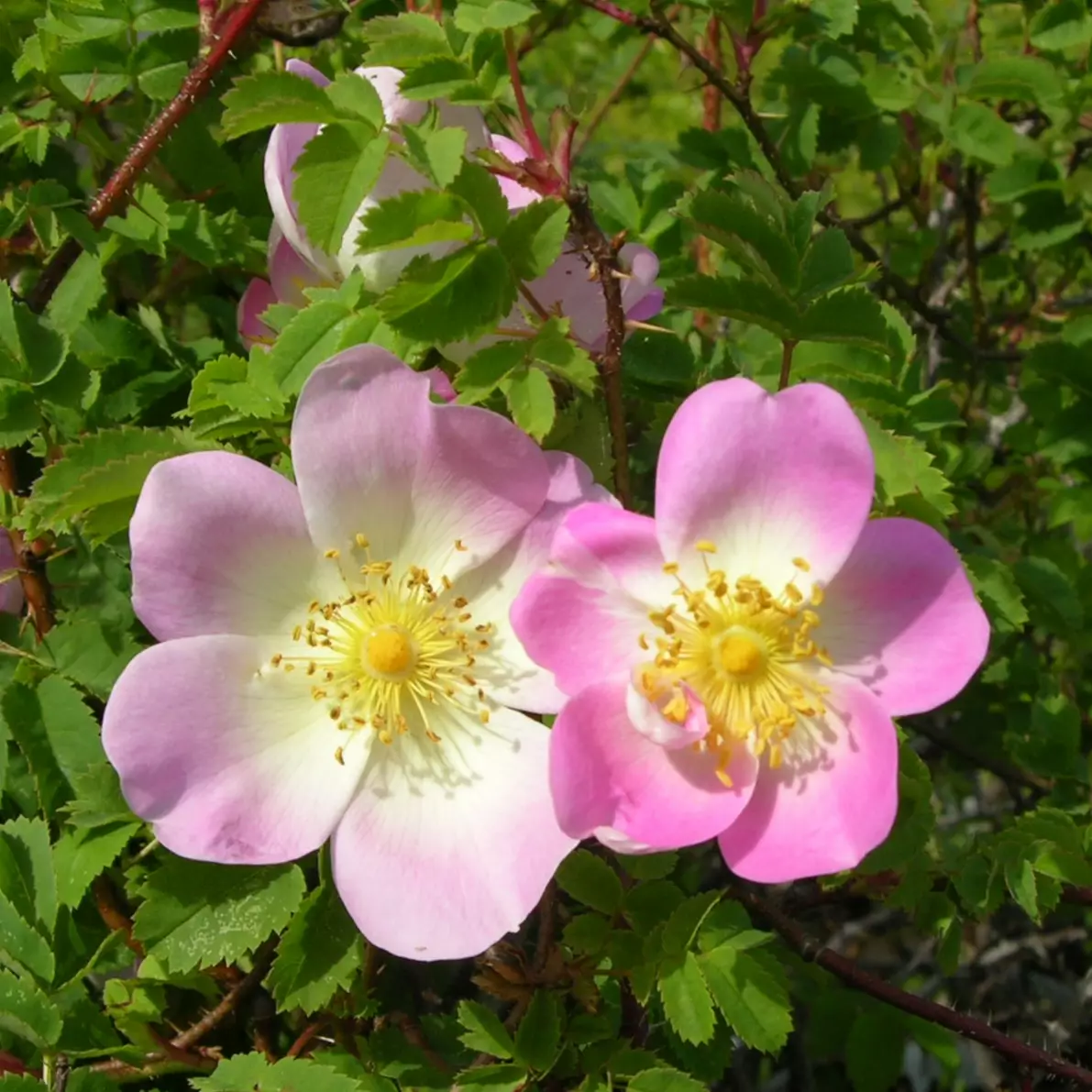 Kotimainen löytöruusu Paimiosta. Kukkii vaaleanpunaisin, yksinkertaisin kukin kesä-heinäkuussa, syyskesällä pensasta koristavat mustat kiulukat.