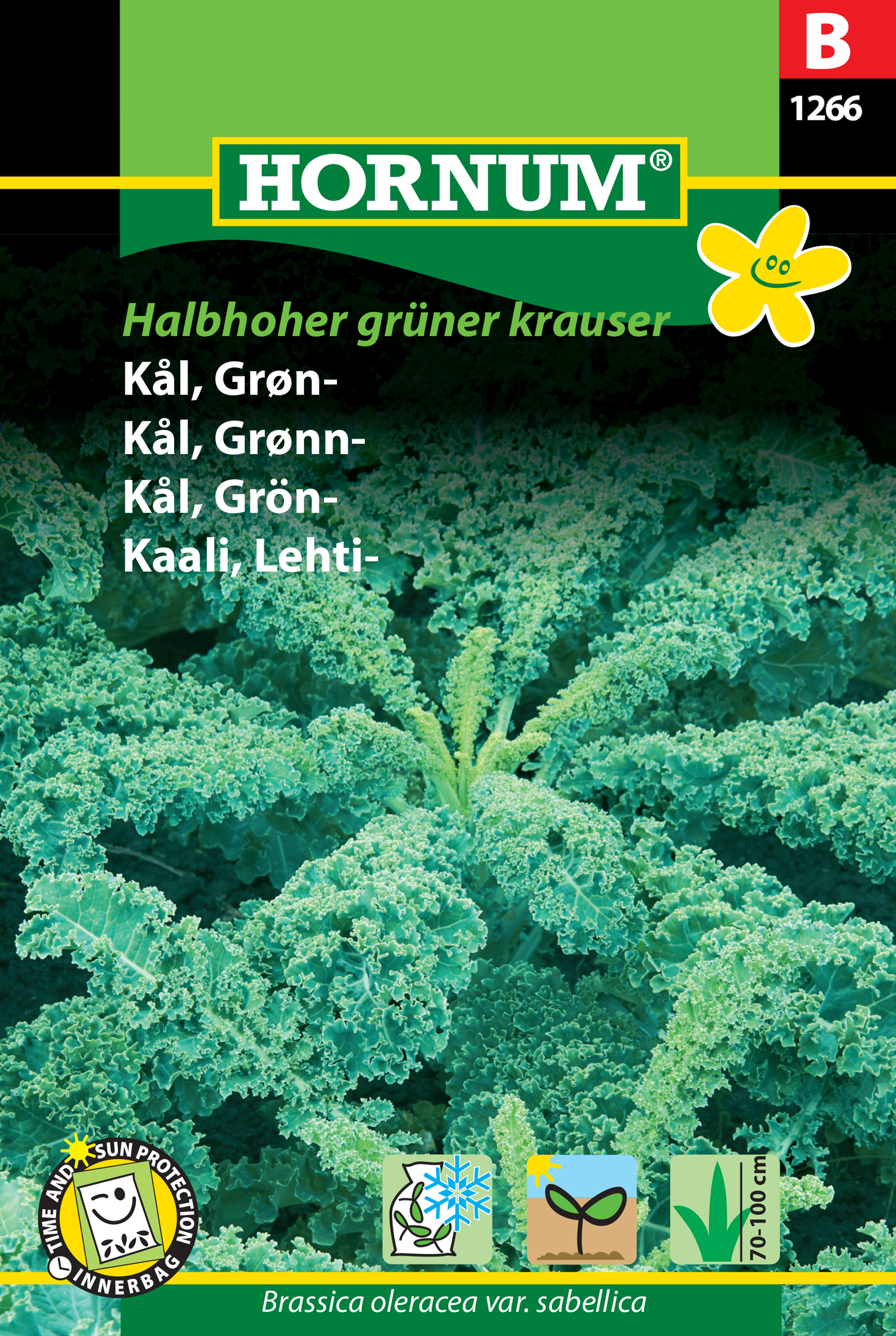 "Viherkaali. Kehittää pitkät, kähärälehtiset, hieman riippuvat lehdet. Erittäin hyvänmakuinen. Runsaasti vitamiineja ja mineraaleja sisältävää vihannesta voidaan käyttää mm. keitettynä, pataruoissa ja keitoissa. Pakkasenkestävä. Istutetaan aurinkoiseen tai puolivarjoiseen paikkaan ravintei kaaseen ja humuspitoiseen maahan. Kylvön jälkeen maata on pidettävä kosteana siihen asti kunnes itääminen alkaa."
