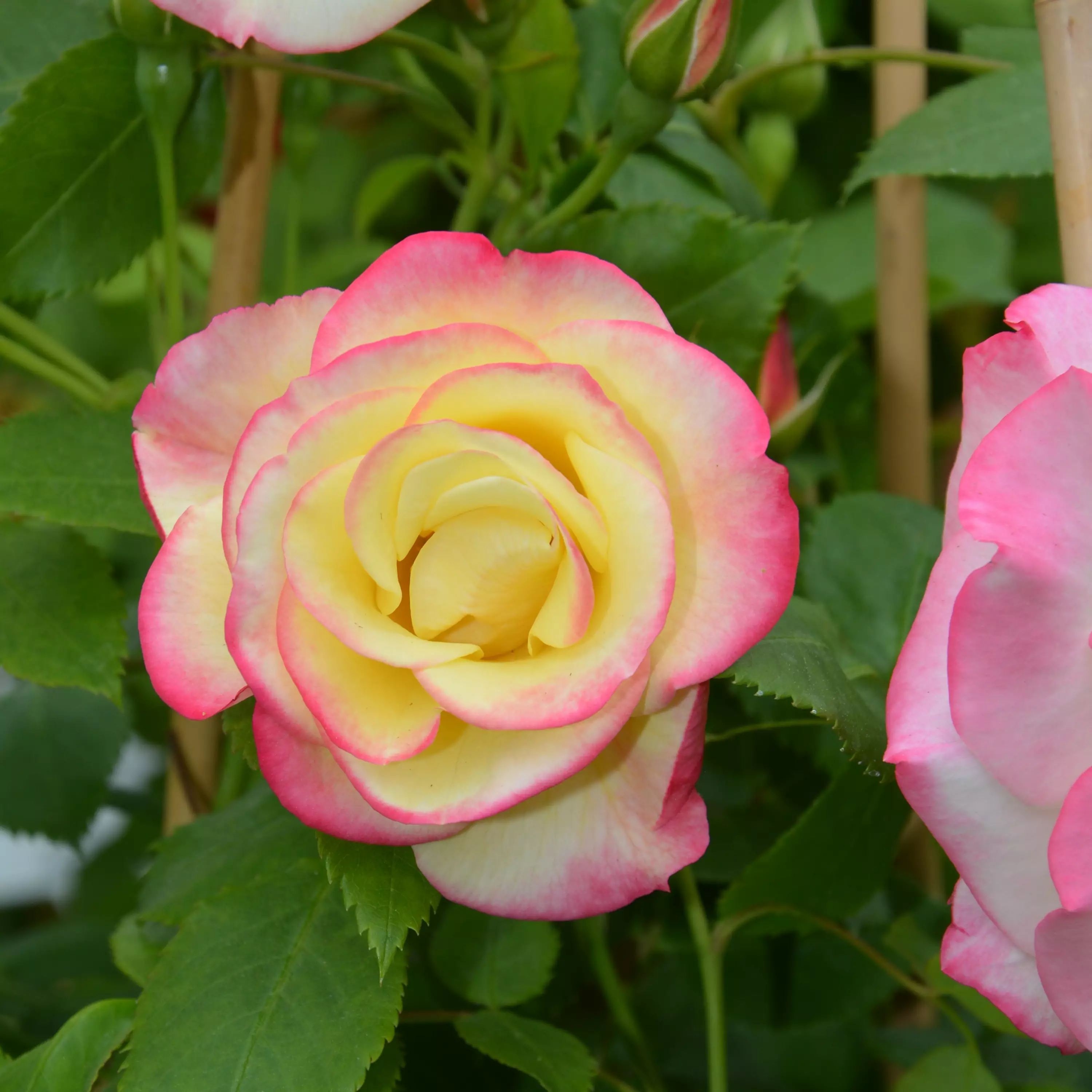 Hieno kanadalainen ruusu, jonka kukat ovat ihanasti kaksiväriset. Keltaisten terälehtien reunoissa on kaunis punerrus, joka vähitellen leviää koko kukkaan.
