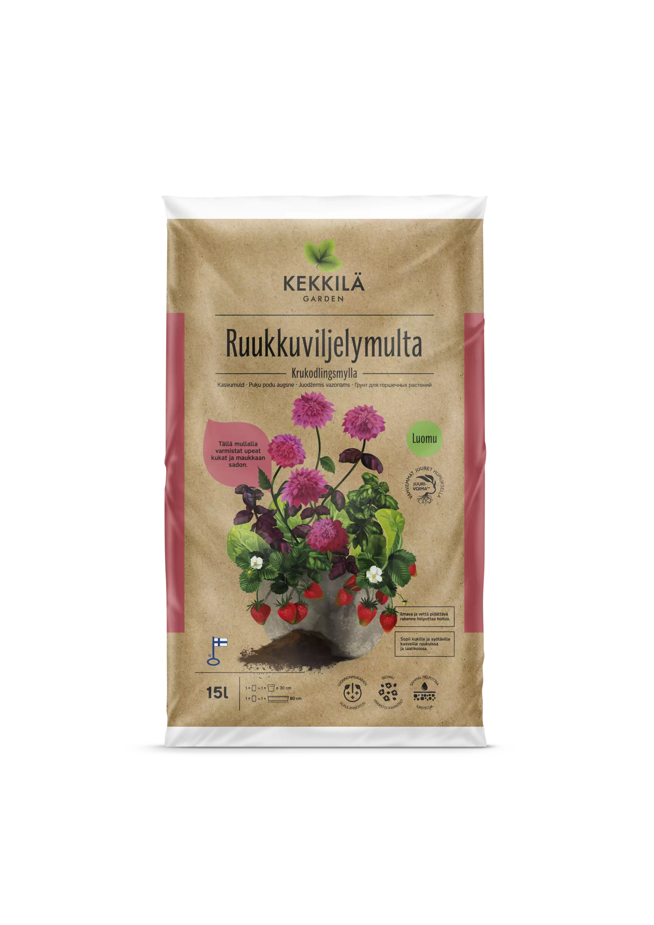 Se sopii kaikille kasveille – niin yrteille, vihanneksille kuin kesäkukillekin. Ruukkuviljelymulta on luonnonmukainen ja kasviperäisesti lannoitettu.