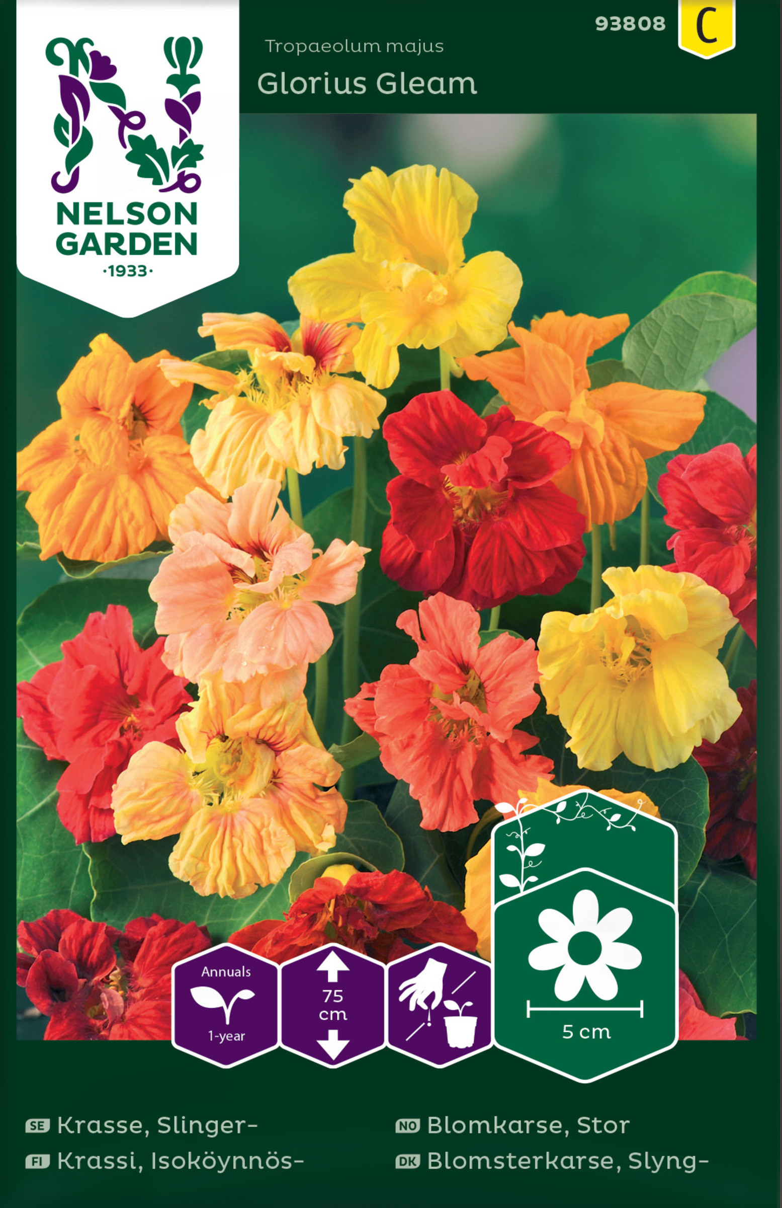 Vacker sort med fyllda blommor i gula, orange och röda nyanser. Fin att odla i ampel, balkonglåda, mot spaljé och som marktäckande växt. Blommorna går att äta, dekorativa i sallader. Omogna... Lue lisää