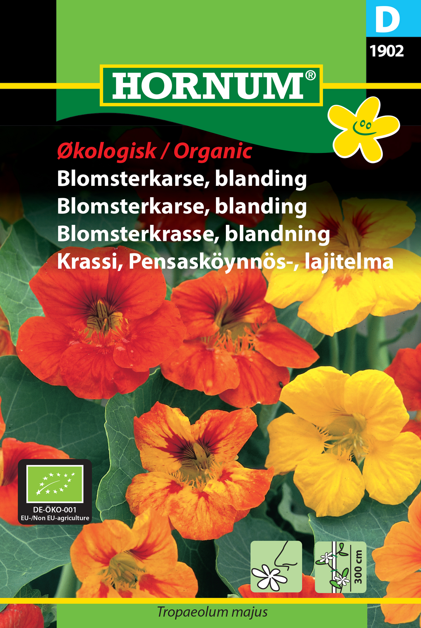 "Yksivuotinen. Köynnöskasvi.Värikylläinen sekoitus punaista, keltaista ja oranssia. Sekä kukat että lehdet ovat syötäviä. Maku on yrttinen ja muistuttaa krassia. Kiva värilisä salaattiin, yrttivoihin tai salaattikastikkeisiin. Suositellaan viljeltäväksi yrttipenkissä, ruukussa tai viljelyaltaassa keittiön läheisyydessä. Viihtyy auringosta puolivarjoon, laihassa ja hyvin vettä läipäisevässä kasvualustassa. Kylvön jälkeen maata on pidettävä kosteana siihen asti kunnes itääminen alkaa."