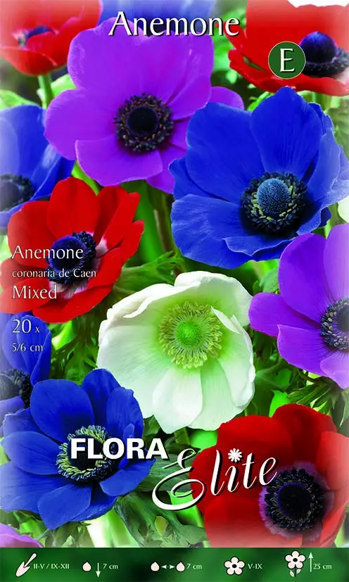 Näyttävä monivärinen kokonaisuus kruunuvuokkoja, jotka yhdessä luovat näyttävän kukinnon puutarhaasii.
