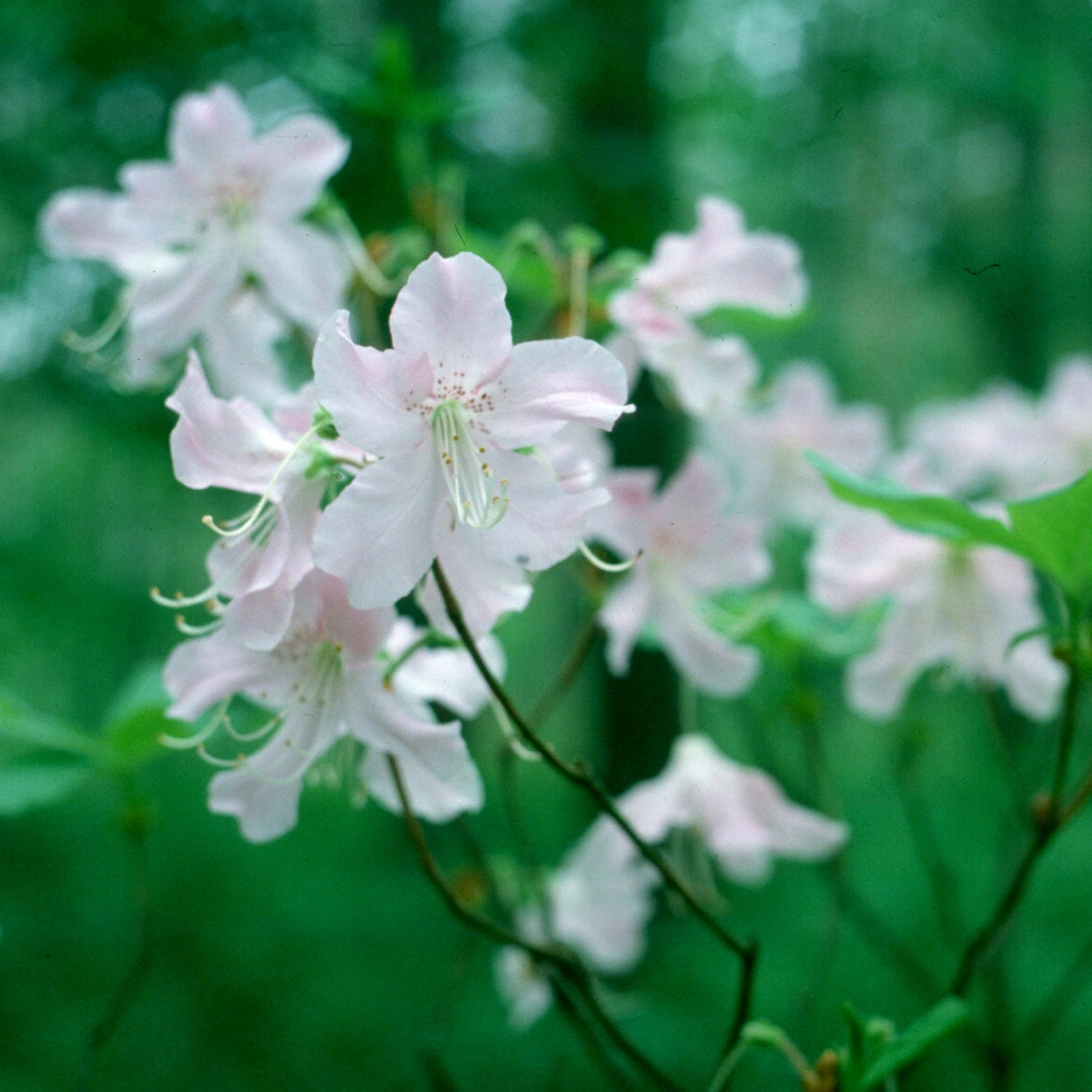 Ihastuttava kotimainen, sirokasvuinen atsalea, joka kukkii vaalean roosanpunaisin, kauniin kellomaisin kukin lehtien puhkeamisen aikoihin.