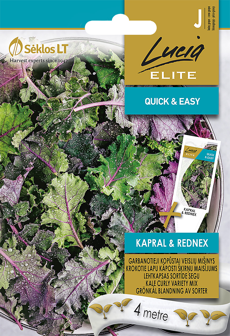 Lajikesekoitus, jossa punaiset ja vihreät kiharaiset lehdet, 30-35 cm korkea. Lehtiä käytetään salaattiin, vihersmoothieihin ja keittoihin. Kasvatetaan kevät- ja syyssatoa varten. Näillä vihanneksilla ei ole ainoastaan suuri ravintoarvo, vaan ne ovat myös koristeellisia kasveja kukkapenkkeihin. Kylvetään maalis-huhtikuussa kevätkorjuulle, toukokuussa syyskorjuulle. Taimet tulee istuttaa 45-60 cm:n etäisyydelle toisistaan, rivien välinen etäisyys 60-80 cm. Jos siemenet kasvatetaan varhain keväällä pieniksi lehdiksi, siemenet tulee kylvää tiheästi; ruokalehdet voidaan leikata tai vetää 20 päivässä. On erittäin tärkeää varmistaa, että kasvavat kasvit saavat riittävästi kosteutta, paras kasvulämpötila +16-17 °C. Syyskorjuuta varten kasvatettu lehtikaali voidaan jättää ulos joulukuuhun asti. Sekoituskoostumus pakkauksessa: 'KAPRAL' 66,6 % (2,66 m), 'REDNEX' 33,3 % (1,34 m). 4 m pitkä nauha tuottaa n. 180 korkealaatuista kasvia ja runsaan sadon.
