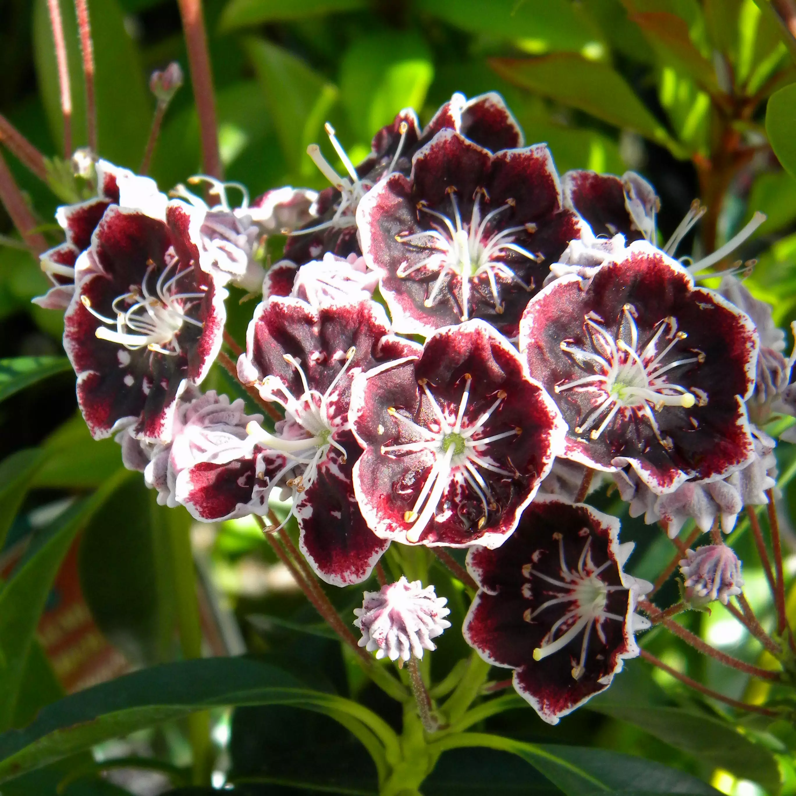 Upea leveälehtikalmia, jonka kukat ovat tummia kuin keskiyö. Hienoa värikontrastia kukintaan tuovat lisäksi valkoiset nuput sekä kukassa oleva kapea valkoinen reuna. Tummanvihreä lehdistö säilyy ainavihantana ja sopii hyvin yhteen alppiruusujen ja havujen kanssa. Viihtyy happamassa ja tuoreeena säilyvässä maassa.