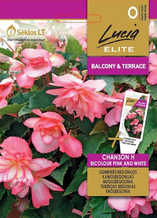 MUKULABEGONIA CHANSON H BICOLOUR PINK AND WHITE. Monivuotinen kasvi, jota viljellään yleensä yksivuotisena. Kukkii koko kesän ulkona, loistavia, suuria, kaksivärisiä kukkia. Sopii erityisesti ruukkuihin ja amppeleihin sekä parvekelaatikoihin. Jotta ne kukkivat koko kesän, niitä tulee kastella ja lannoittaa säännöllisesti. Istuta ulos, kun pakkasvaaraa ei enää ole. Kuihtuneet kukat on suositeltavaa poistaa. Siemenet on päällystetty, käsitelty sideaineilla ja helppo kylvää. Esikasvatus tammi-maaliskuussa pintakylvönä. Jotta siemenet itävät, on tärkeää huolehtia kosteudesta. Istutusväli 40 x 40 cm. Kukkii toukokuusta syyskuuhun. 10 siementä riittää 3 m² kukkapenkkiin tai 7-8 ruukkuun.