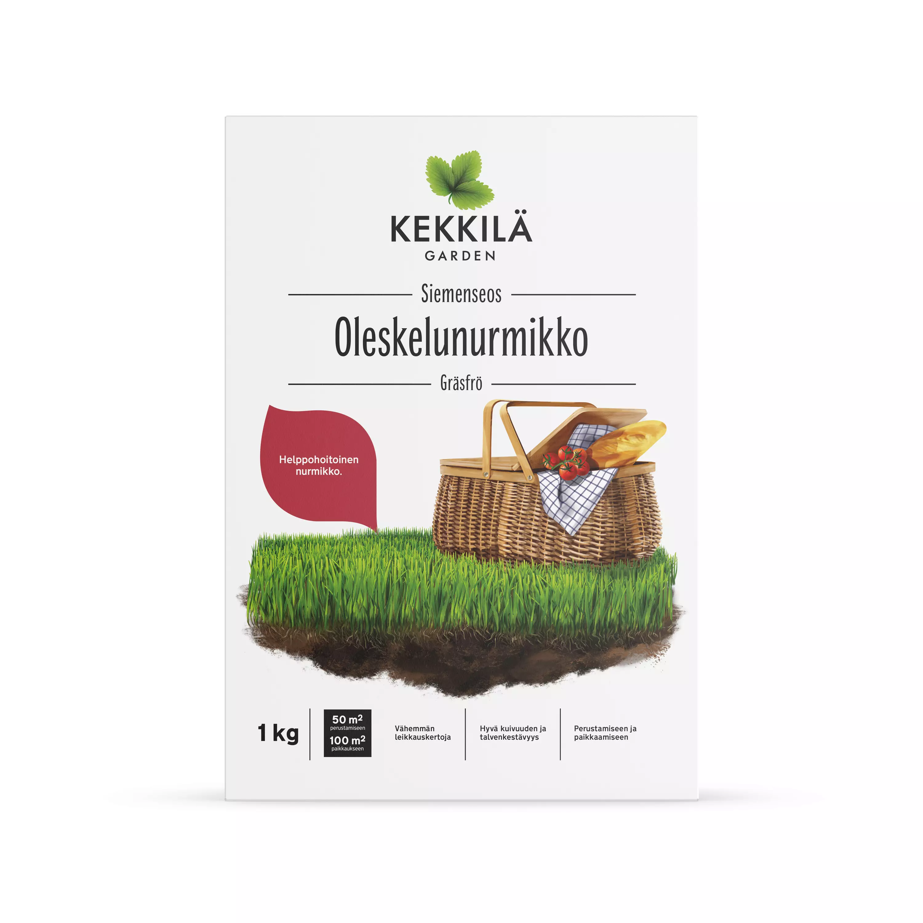 Kekkilä Oleskelunurmikko on laadukas siemenseos kauniille, tiheästi kasvavalle ja tasaisen pehmeälle nurmikolle. Kestää hyvin lyhyeksi leikkauksen ja tarvitsee vähemmän leikkauskertoja. Siemenseos kauniille, helppohoitoiselle nurmikolle. Hyvä talvenkestävyys. Riittoisuus: 50 m² perustamiseen / 100 m² paikkaukseen.