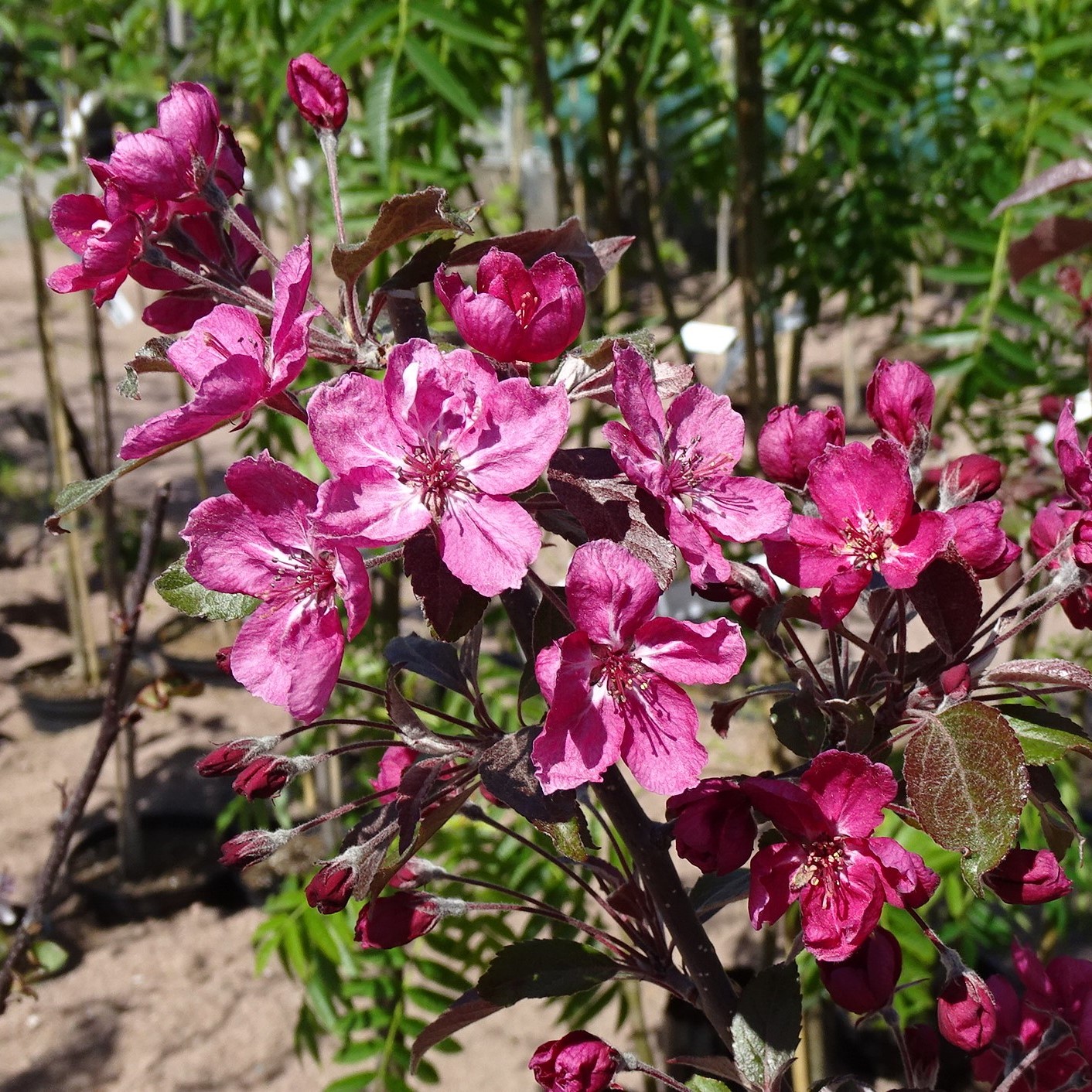 Erityisen kauniskukintainen, matalakasvuinen pikkupuu. Sopii hyvin pieniin pihoihin ja istutusaltaisiin. Kukat ovat tummanpunaisia, puolikerrannaisia ja vienosti tuoksuvia. Koko kesän punertavalehtinen, väri on voimakkain nuorissa lehdissä. Syyskesällä kehittyvät omenat ovat pieniä, halk. 1-1,5 cm, tumman viininpunaisia. Ne koristavat puuta pitkälle syksyyn. Viihtyy kalkitussa ja multavassa maassa. Suojaa puu jyrsijöiltä.
