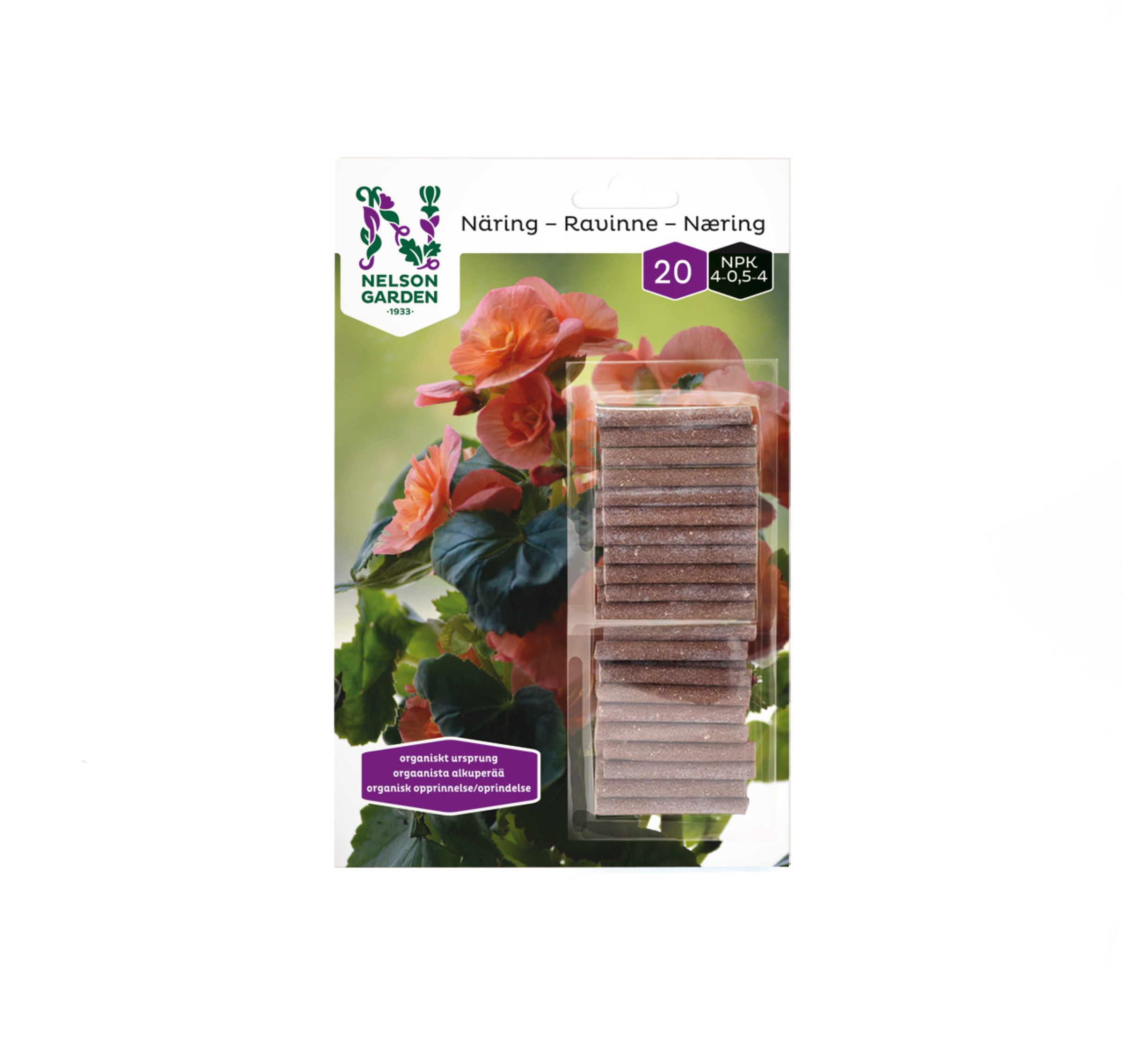 5-0,5-4,5 Tuoteseloste: Kokonaistyppi (N) 5 %, vesiliukoinen typpi 0,1 %. Ko- konaisfosfori (P) 0,5 %, vesiliukoinen fosfori 0,3 %. Kalium (K) 4,5 %. Magnesium (Mg) 0,3 %. Rikki (S) 2,5 %, vesiliukoinen rikki 2 %. Orgaaninen aines 75 %. Kosteus: 5 %. Orgaaninen ravinne ruukkukasveille luomulaatuisista lähteistä. Helppo käyttää. Puikko työnnetään multaan, jolloin ravinteita vapautuu jokaisella kastelukerralla kolmen kuukauden ajan. 20kpl/pakk. NPK 5-0,5-4,5 — Tee näin: Paina multaan tasaisin välein ruukun reunaa pitkin. Vastaistutetut taimet tulee lannoittaa vasta noin 2 viikon kuluttua. — Annostus ruukun halkaisijan mukaan: Ø12 cm: 3 kpl, Ø16 cm: 6 kpl, Ø20 cm: 9 kpl. Toista noin kolmen kuukauden välein. Puolita ravinneannos lepokauden aikana.