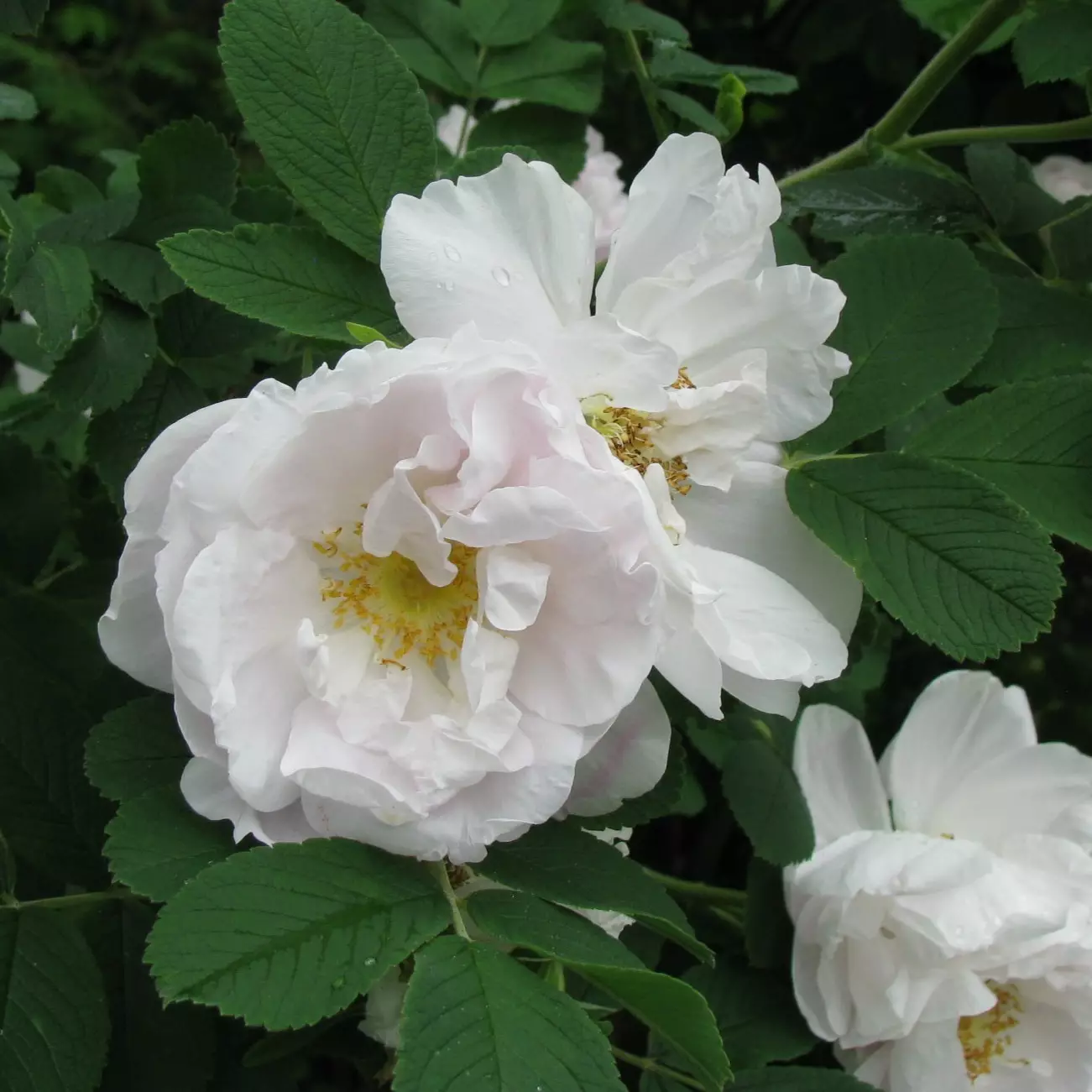 Kestävä ja terve, helppohoitoinen pensasruusu. Pystykasvuinen, lähes piikitön, hyvä aidanteisiin ja isoihinkin ryhmiin. Tekee juuriversoja. Aloittaa kukintansa kesä-heinäkuulla ja sitä jatkuu syyskesään saakka. Kukkien nupuissa on hieman punaista, mutta kukat ovat valkoiset, puolikerrannaiset. Niissä on mausteinen, keskivahva tuoksu. Tekee runsaasti punaisia, litteänpyöreitä kiulukoita. Istutusväli 0,7 m.