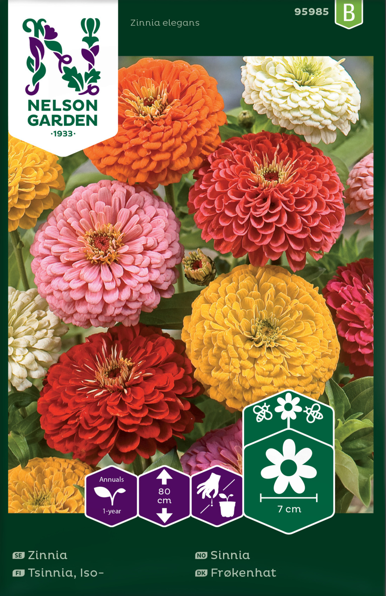 Trevlig sommarblomma med lång blomningstid. Den har styv, upprätt stjälk med en eller flera fyllda blommor i toppen. Skär man av kvistar grenar sig plantan. Färgstarkt inslag i rabatt och kruka. Hållbar snittblomma. Blandning i många färger med stora blommor. Trivs i välgödslad och näringsrik jord. Vattna vid torka. Isotsinnia Hauska ja pitkään kukkiva kesäkukka. Kasvin varsi on jäykkä ja pystysuora. Sen päässä on yksi tai useampia täyteläisiä kukkia. Oksia katkomalla taimi saadaan haaroittumaan ja tekemään uusi kukkaversoja. Värikäs lisä kukkapenkkiin ja ruukkuun. Hieno ja kestävä myös leikkokukkana. Sekoitus sisältää useita värejä, kukat ovat suuria ja muistuttavat daaliaa. Viihtyy hyvin lannoitetussa ja ravinteikkaassa maassa. Kastele kuivuuden vallitessa.
