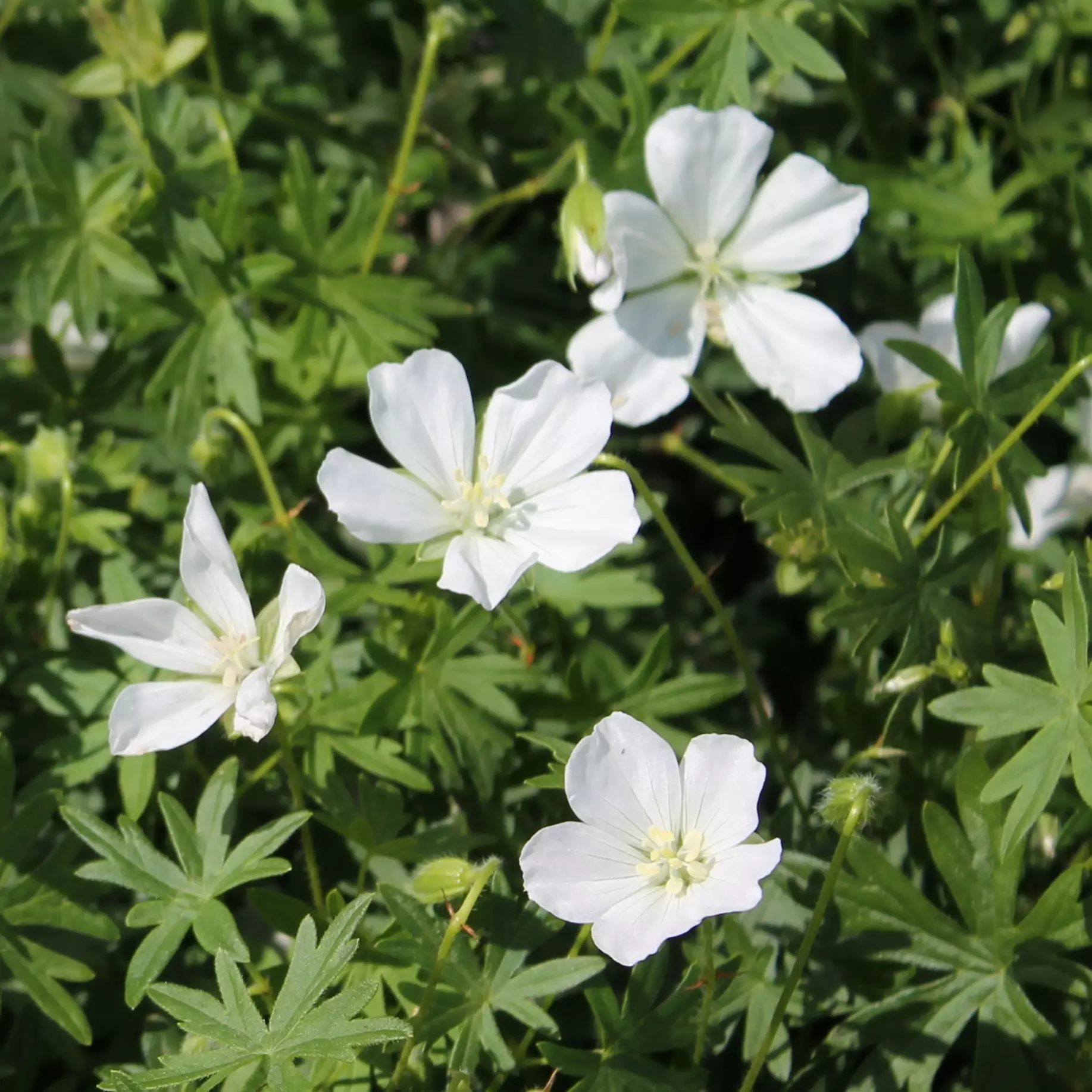 Valkokukkainen verikurjenpolvi. Sopii kivikkoryhmään, muurien reunoille sekä kääpiöhavujen seuraan.